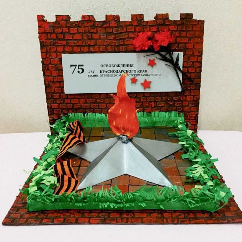 Дети старших групп мастерят объемные макеты. Ребята изображают как придуманные композиции, основанные на впечатлениях из фильмов, книг, так и реальные мемориалы, например, «Мамаев Курган». Обязательным элементом каждого макеты является «Вечный огонь».