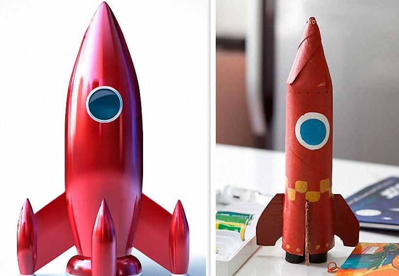 Нижние крылья, можно соорудить из картона. Начертив четыре треугольника, размером 3*3 сантиметра, покрасить или обклеить с обеих сторон. Отступив пять миллиметров от любого края, сделать сгиб, промазать клеем и соединить с нижней частью основы. Ракета готова ко взлету.