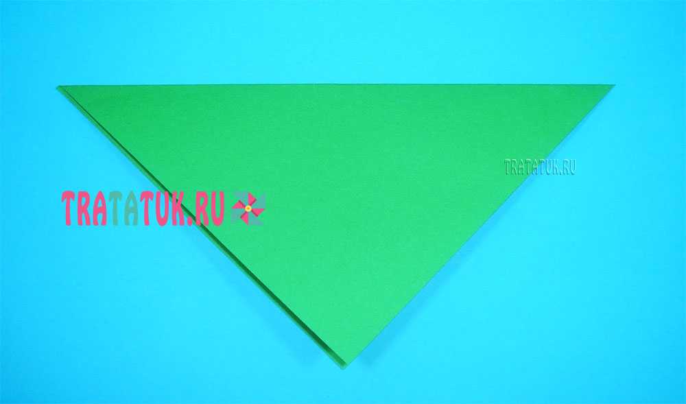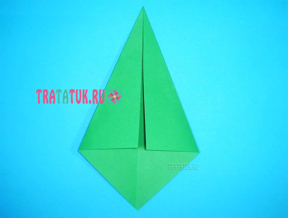 На фото этот шаг не отображен, но дети могут сложить бумагу еще раз, чтобы определить серединку треугольника. Можно пропустить этап и сразу приподнять правый и левый уголки вверх, расставив их по максимуму симметрично по отношению к верхнему уголку. Цветок уже готов. По желанию, можно вырезать два зеленых треугольничка или четвертинку круга и приклеить его (их) к основанию цветка.