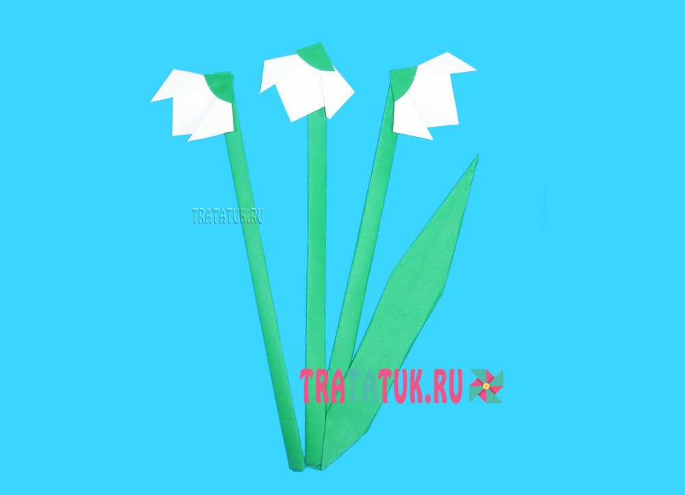Далее по собственному желанию, вырежьте из зеленой бумаги или сложите стебель и лист. Приклейте к ним цветок. Подснежник оригами готов.