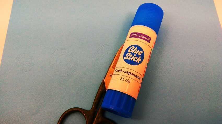 1. Возьмите для работы бумагу. Подберите лист для фона, например, здесь использовалась голубая бумага, на которой красиво будет смотреться предложенная стрекозка. Для детей подготовьте обычный клей-карандаш – безопасный и удобный в обращении, с помощью него они будут крепить детали на основание, и безопасные ножницы, если вы планируете доверить ребенку вырезание разных элементов.