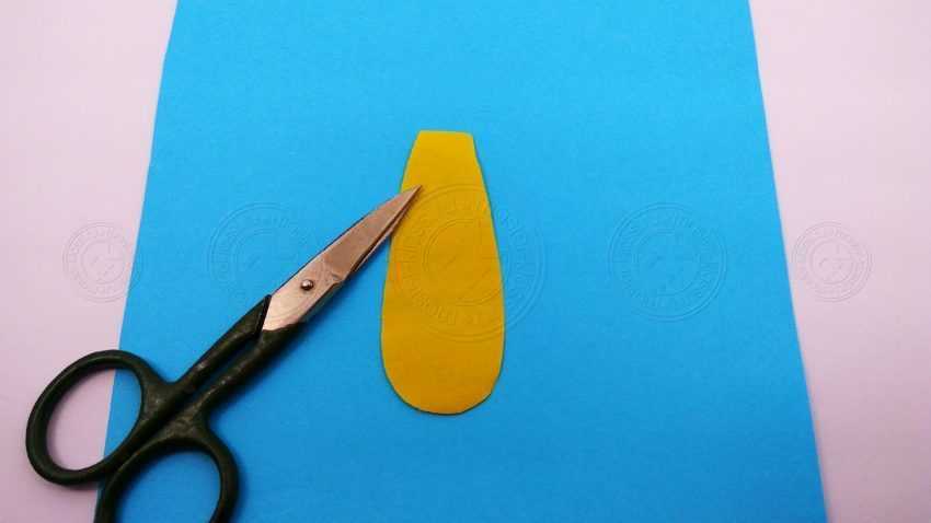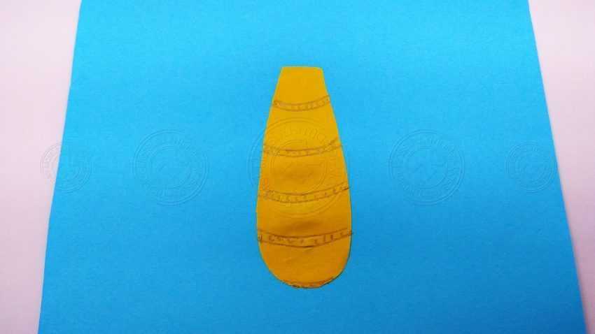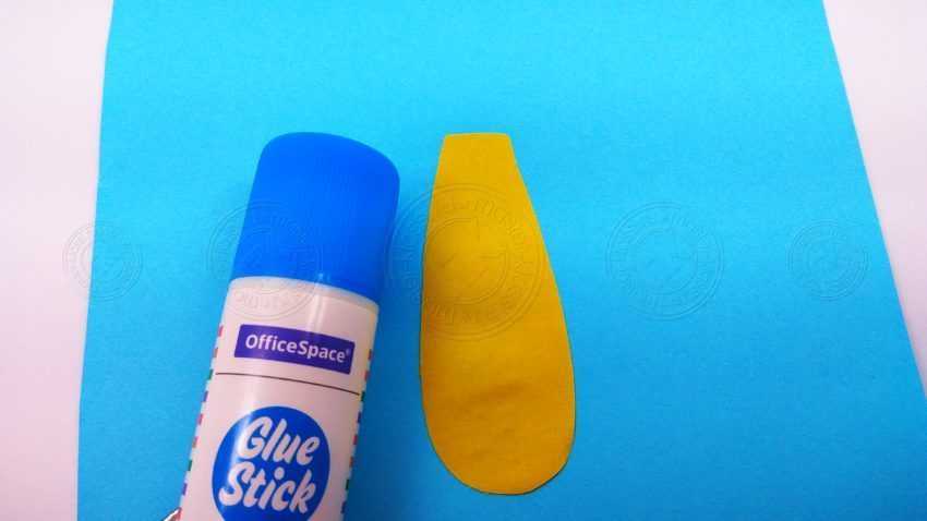 2. Вырежьте из подготовленного голубого листа прямоугольник любого размера, и это будет фон для вашей аппликации. Теперь используйте разные кусочки бумаги для моделирования отдельных частей стрекозки. Для туловища вырежьте желтую деталь, напоминающую капельку.