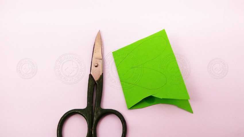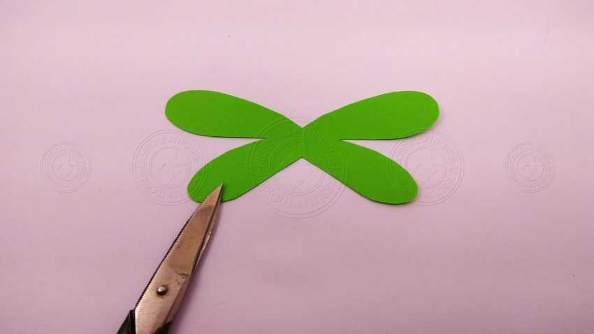 10. Теперь нужны крылышки. Для их создания подойдет также яркая бумага, но желательно, чтобы она была белая или голубая. Однако поскольку фон голубой, то лучше их сделать более яркими, например, салатового цвета. Небольшой отрезок салатового листика согните пополам, карандашом нарисуйте двойные крылышки и подготовьте ножнички.