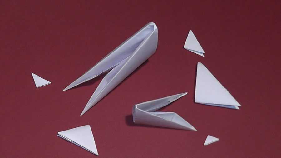 Из этих модулей и делают оригами. Соединяются они посредством вставки угла одной детали в карман другой.