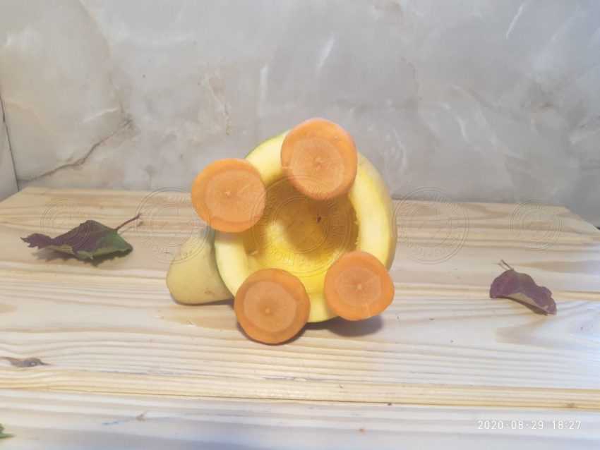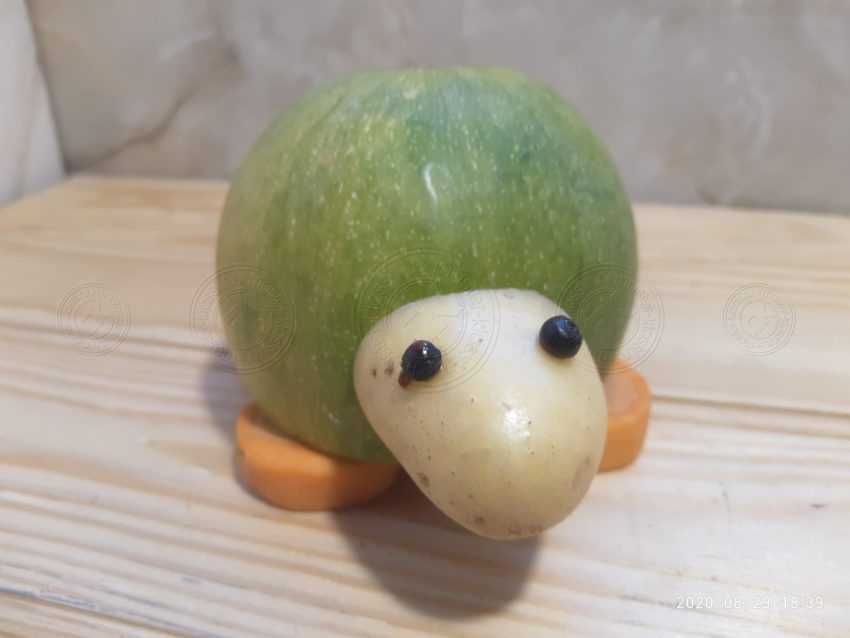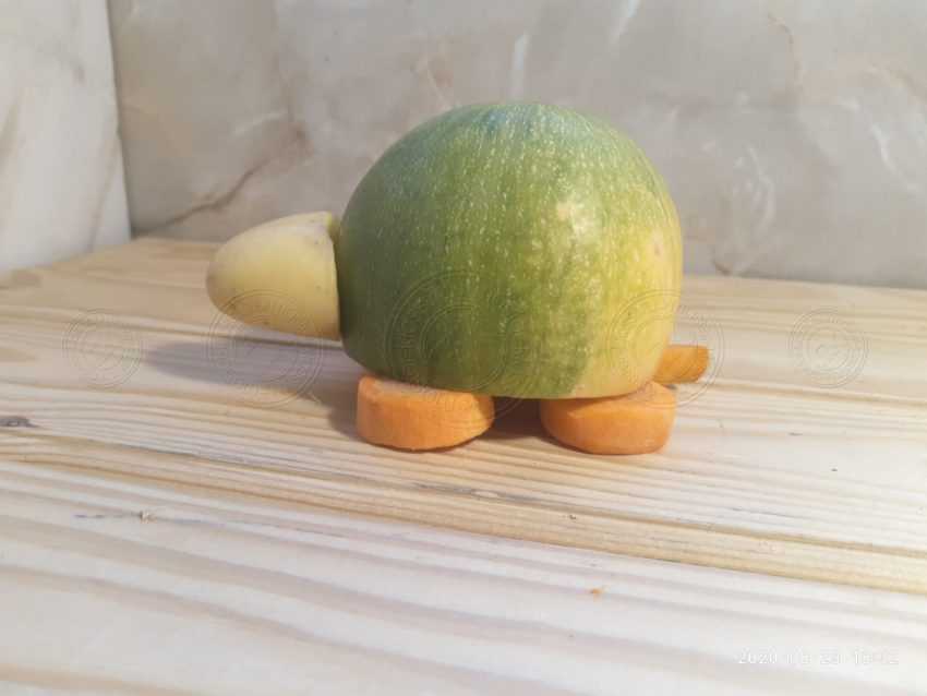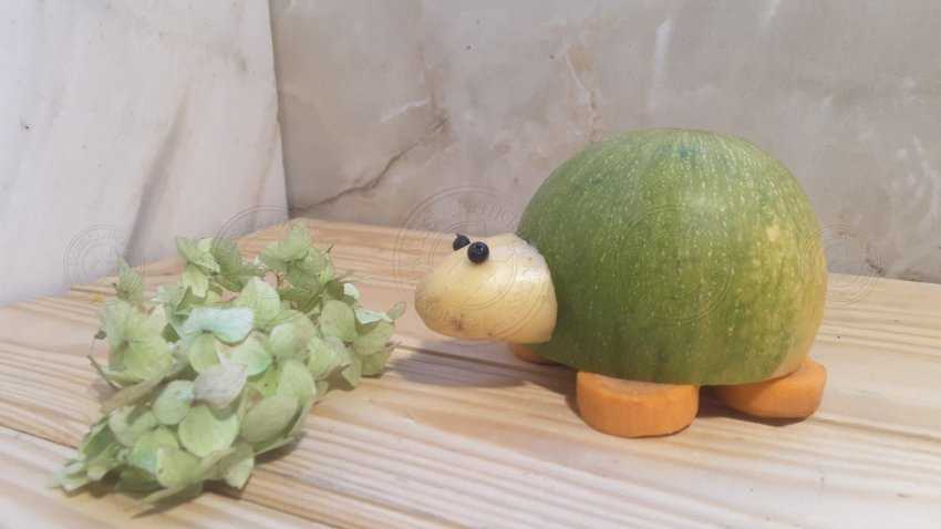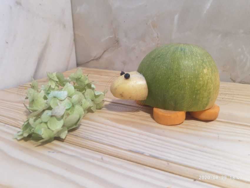 Кабачки бывают разных форм и цветов. В конечном счете, туже тыкву относят к ним, поэтому самое трудное тут будет найти плод необходимый нам формы. Понадобится круглый кабачок, при этом какой у него будет оттенок кожуры значения не имеет, хотя привычнее будет видеть зеленый цвет подстать тому, какой он у панциря. Картофель лучше всего отварить, так он будет мягче и ребенку справится с поделкой, будет проще. Хотя можно использовать и просто мытый.