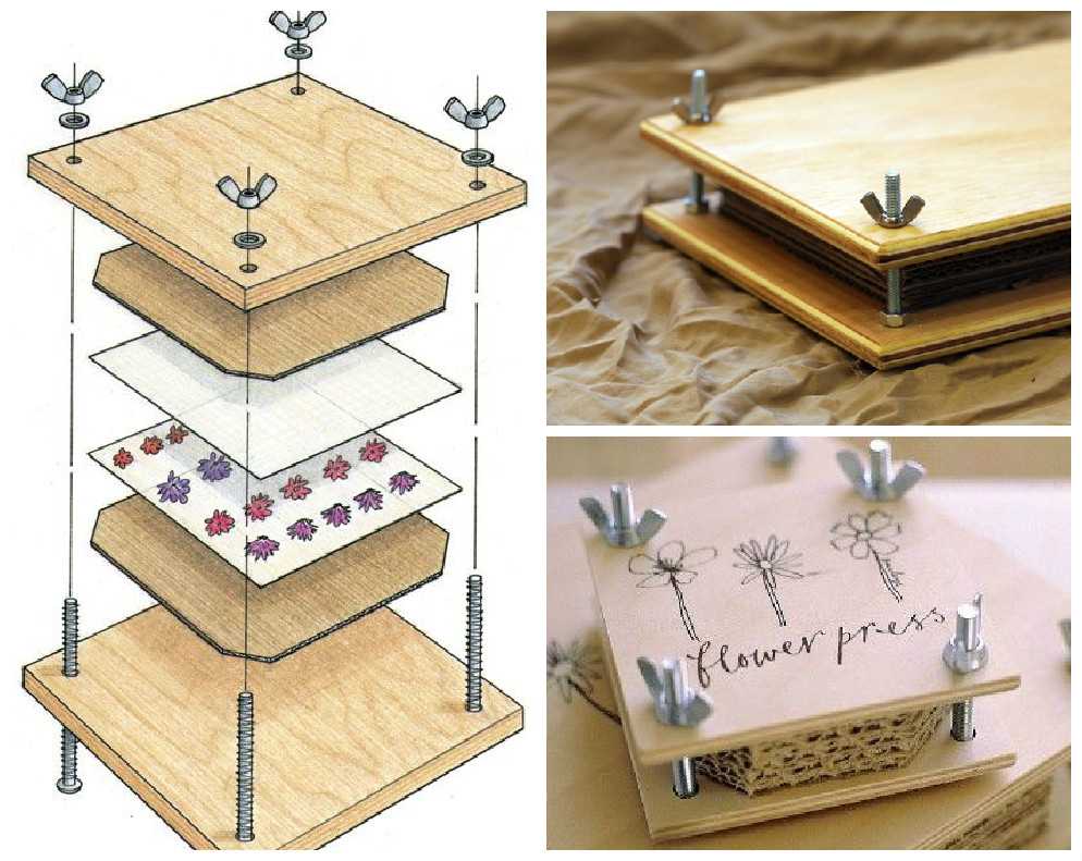 Для сокращения времени высыхания, можно купить или смастерить цветочный пресс. Для этого вам понадобятся две квадратные доски, акварельная бумага, дрель и болты с гайками. Нужно по углам досок просверлить дырки в одинаковых местах. Далее поместите между досками бумагу и растения, обернутые бумажными полотенцами, и соедините болтами.