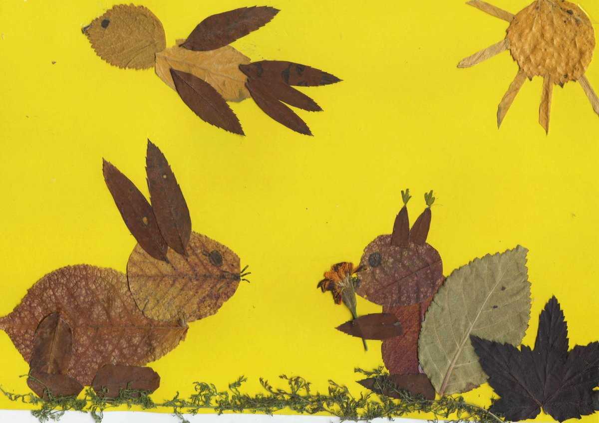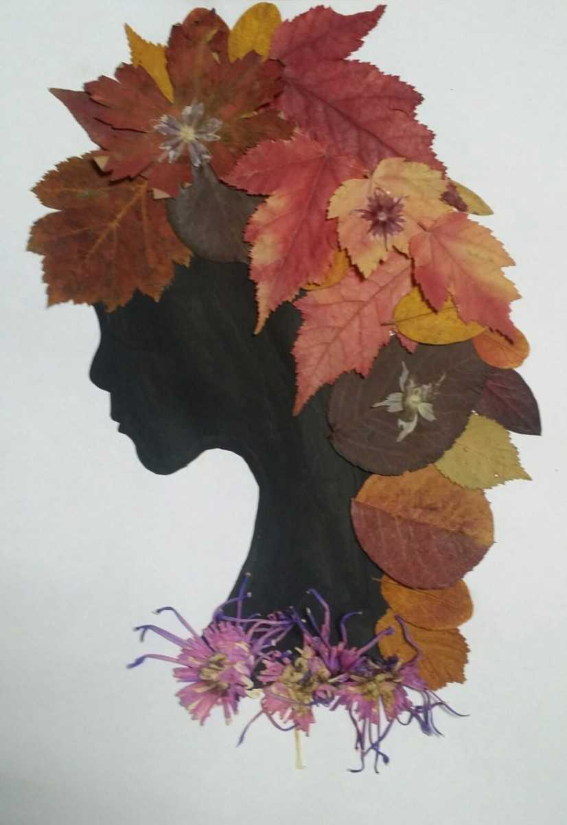 Аппликация — составление картины из отдельных кусочков различных материалов. Этот вид творчества считается детским, так как для работ обычно выбирают лаконичные сюжеты (фигурки зверят или простенькие пейзажи). Однако ничто не мешает взрослому человеку создать «лоскутную» картину небывалой сложности, хотя начинающим лучше пробовать с примитивных форм. Из листьев получаются великолепные зверушки. Рябиновые или ореховые листочки, приклеенные слоями, образуют пышные крылья бабочки. Ее тельце можно выполнить из березовой сережки. По сходной технологии делают ежиков и рыбок. Их иголки и чешую заменяют на остренькие листочки (орех, граб), которые приклеивают слоями друг на друга. Пара кусочков коры сымитирует дерево, а тонкие травинки превратятся в колышущиеся водоросли. Забавный зонтик станет последним штрихом в осенней картине. Его можно сделать из обрезанного листа клена. Зонты из разноцветных кусочков фетра будут смотреться тепло, уютно и очень по-домашнему. Пышная грива льва или роскошный павлиний хвост делается из кленовых листьев. Их острые кончики больше всего походят на густую шевелюру и букет перьев. Символ мудрости — сову проще всего изготовить из тонких листиков ивы. Готовую аппликацию помещают в фоторамку, но намного красивее будет смотреться обрамление из веток, сделанное своими руками. Можно использовать березу, дуб, бамбук. Веточки тщательно защищают от сучков и остатков коры, после чего из них формируют прямоугольник, углы которого завязывают джутовыми нитками, скрепляя компоненты между собой.