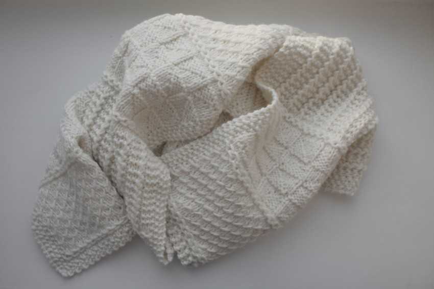 В итоге должно получиться такое изделие как на фото. В мастер-классе шарф вяжут на всю длину. Можно набрать количество петель равное ширине снуда, тогда вязать его будет легче, узор смотрится немного иначе.