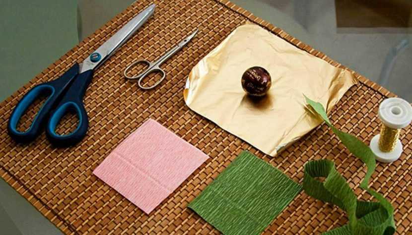 - Главный элемент подарка — обычные конфеты или рафаэлло.