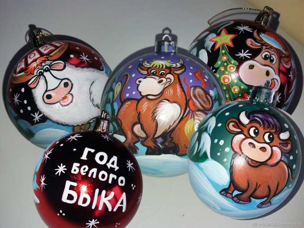 Самая легкая идея — украсить готовый простенький елочный шарик, нарисовав на нем быка, коровы или теленка, как на фото ниже. Особенных умений в этом случае не потребуется, зато такой декор будет настоящей «фишкой» вечера.