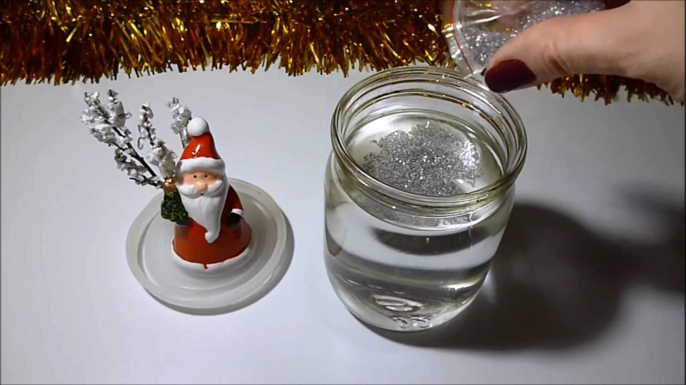 Шаг 2: Наполнить банку водой с глицерином в равных пропорциях. Добавить в полученную смесь блестки и хорошо перемешать.