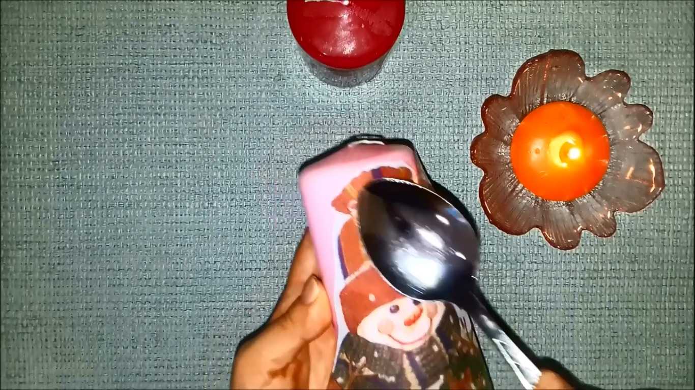 Шаг 2: Нагреть ложку над обычной свечой приглаживать салфетку к свече. Делать это быстрыми без сильных надавливаний движениями от центра к краю. За счет того, что ложка горячая, парафин начнет слегка расплавляться и салфетка приклеится к свече.
