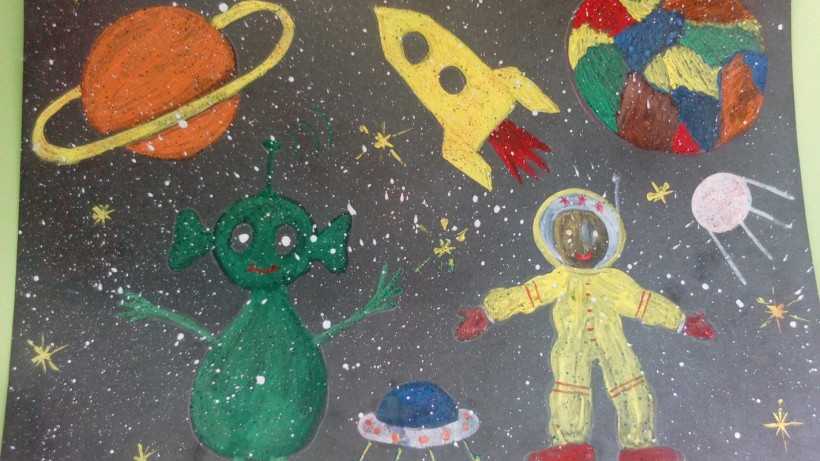 Возраста от четырёх лет космос глазами детей может быть запечатлён на бумаге с помощью вырезанных фигур. Это может быть картинка в виде ракеты летящей в просторах космоса или в виде планет. Красиво будет смотреться летающая тарелка из диска или пластиковой посуды, подобные примеры мы рассматривали на Megamaster.info.