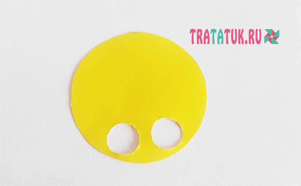Чтобы закончить подготовку деталей для бумажного жирафа-игрушки, нужно в большом желтом круге снизу вырезать две маленькие дырочки, по размеру пальчика ребенка. Лучше если это сделают взрослые, так как пробивать картон трудно и ребенок может пораниться. Проблема отпадает при наличии специального компостера, быстро и красиво вырезающего дырочки.