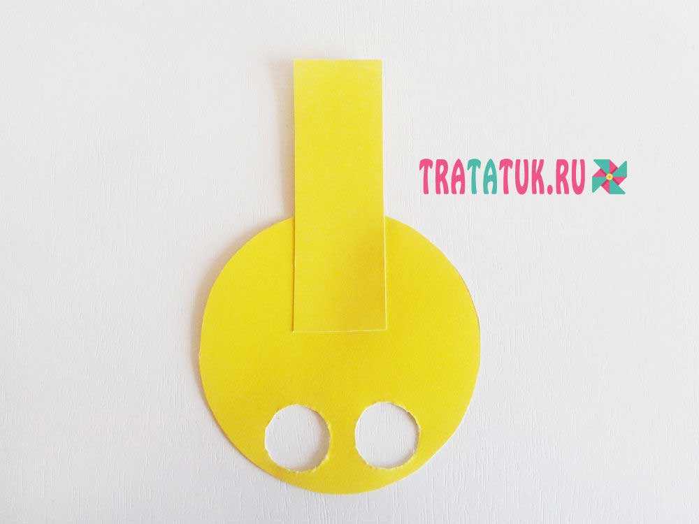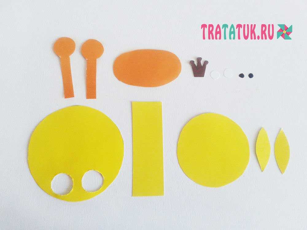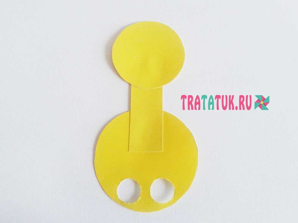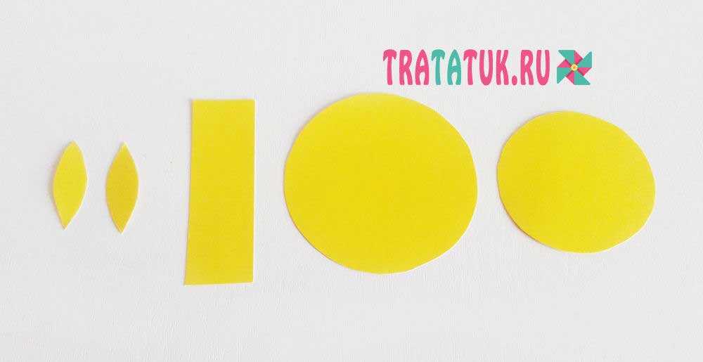 Из желтого картона вырезаем два круга: один побольше – для туловища, а другой поменьше – для головы. Для шеи понадобится полоска желтого картона, в расчете, что она должна захватывать два круга и иметь немного свободного пространства. Также вырезаем ушки из сложенного вдвое картона. Так они будут абсолютно идентичными, чем когда вырезать их по отдельности.