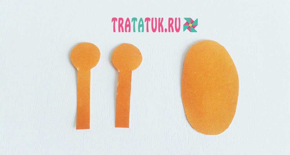 После этого переходим к оранжевому картону, вырезаем из него рожки, утолщенные и скругленные на конце, кстати, они называются оссиконы, а также овал-мордочку, высотой на пол головы жирафа и чуть шире ее длины.
