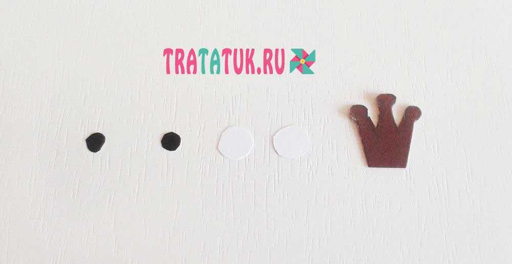 Подготавливаем и мелкие детали – белые с черными кружочки для глаз, коричневую коронку. На самом деле в области лба у жирафа нет именно такой коронки, подобное изображение больше мультяшное, как раз для деток. У жирафа же на том месте своеобразный костный нарост, который иногда по ошибке считают за еще одну пару рожек.