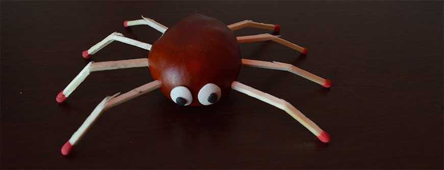 В каштане по бокам делается по четыре отверстия, в них вставляют надломленные зубочистки – это будут лапки. А из пластилина лепят глазки. Паучок готов.