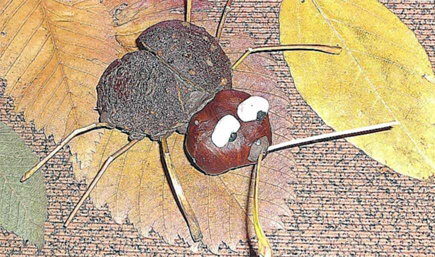 - Теперь из каштана крепят голову жуку, на ней нужно сделать глазки из пластилина и усики.