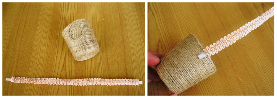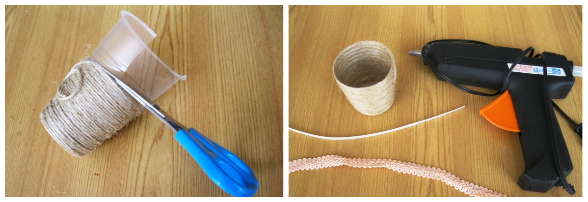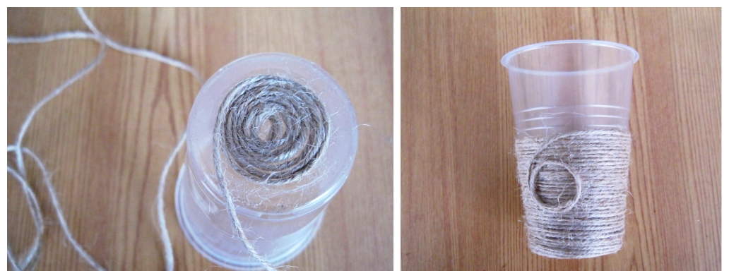 Нить приклеить к стаканчику клеем. Накручивая ее по кругу, поднять до середины.
