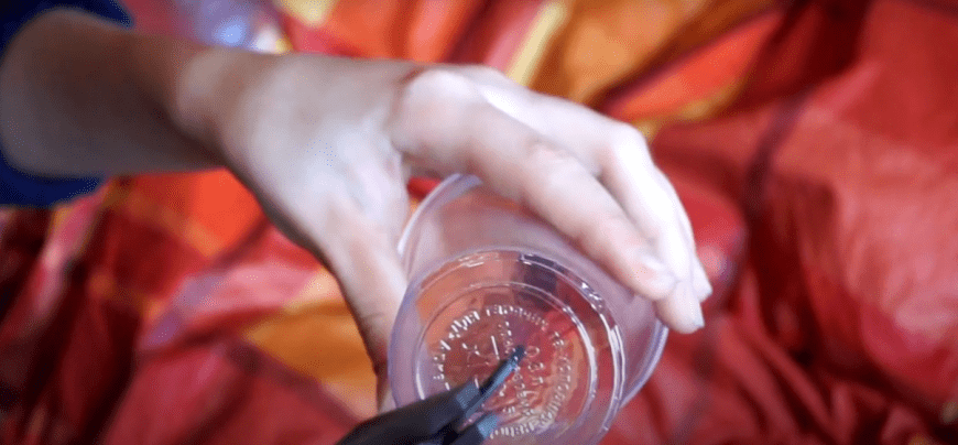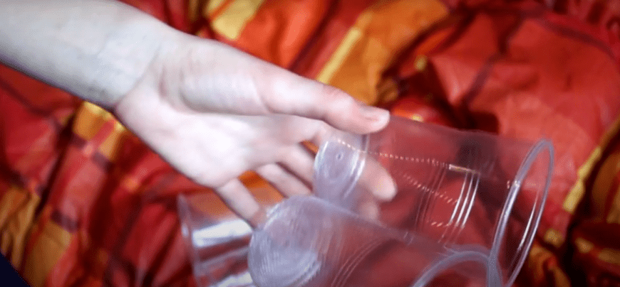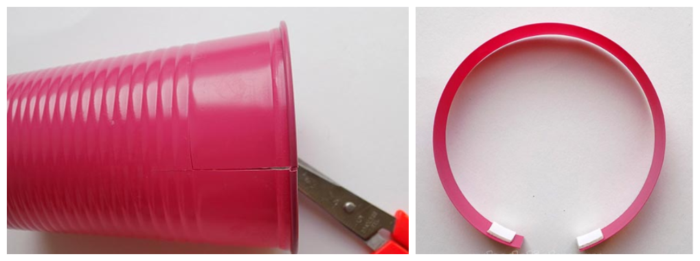 От второго пластикового стаканчика отрезать часть и прикрепить на края двусторонний скотч.