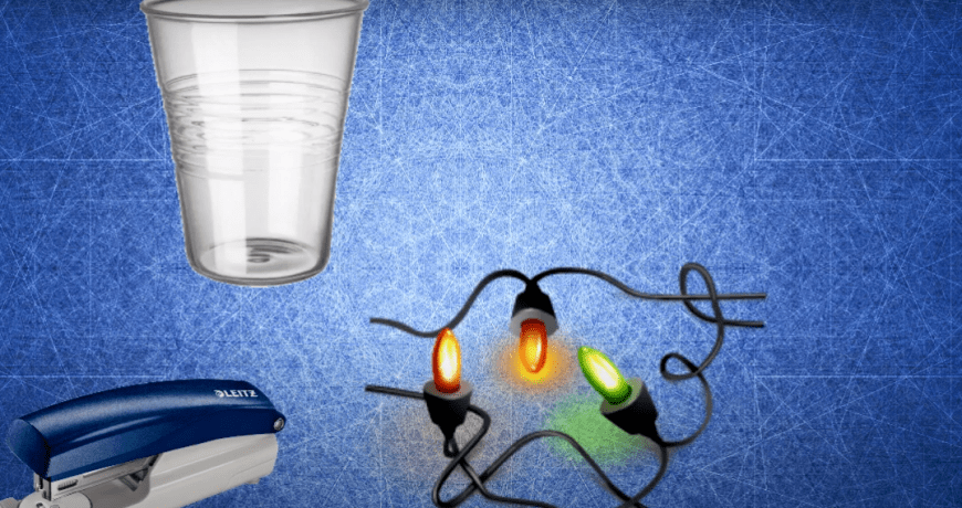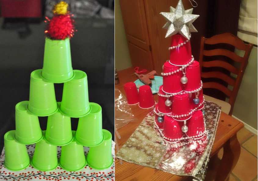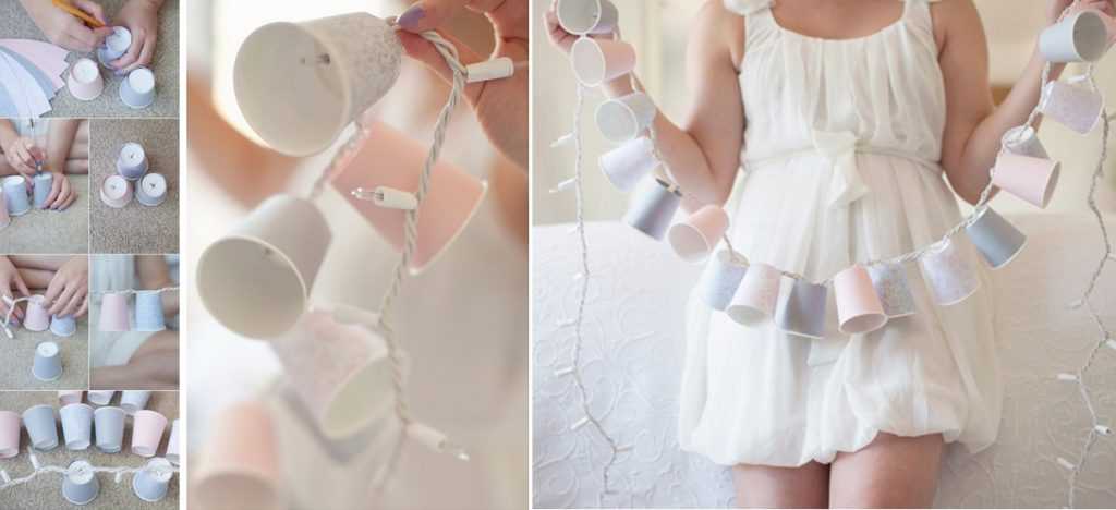 Вы можете сделать своими руками поделку-гирлянду из стаканчиков. Все что вам понадобится — самая прозаическая гирлянда, стаканы, и нож.
