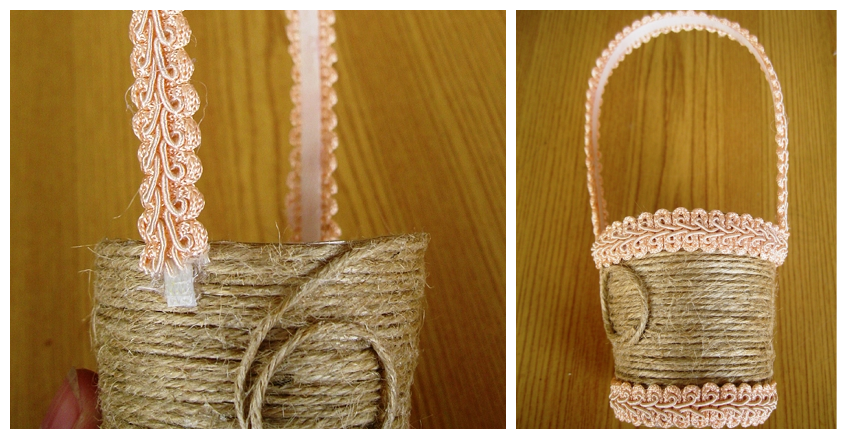 Сделайте ручку корзинке из синельной проволоки. А саму корзинку украсьте бумажными цветами.