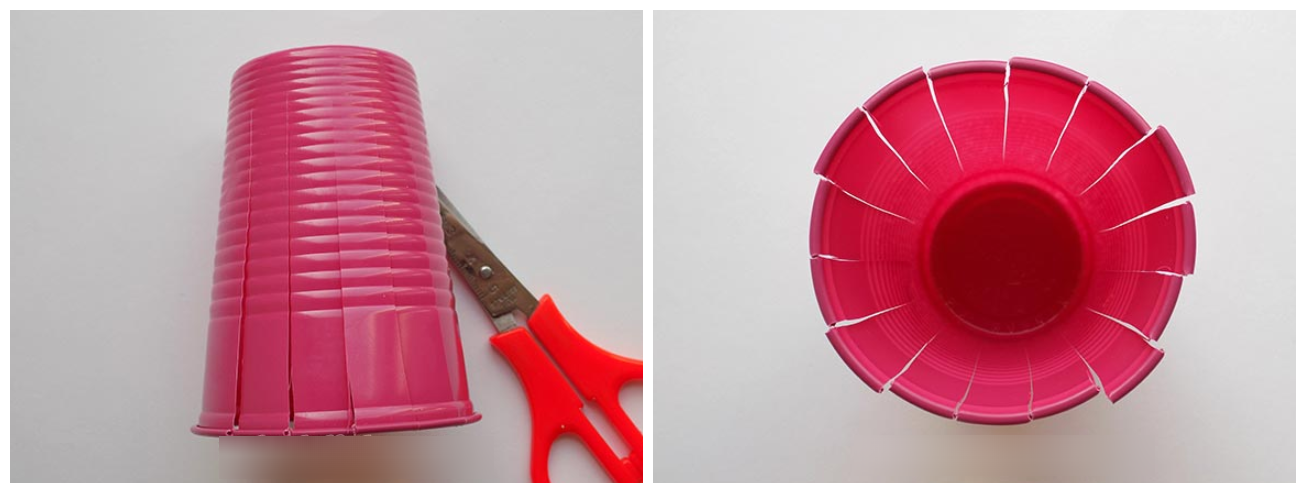 Один пластиковый стаканчик сверху ко дну разрезать, не доходя до него на 2 см. Ширина полосок должна быть около 1 см.