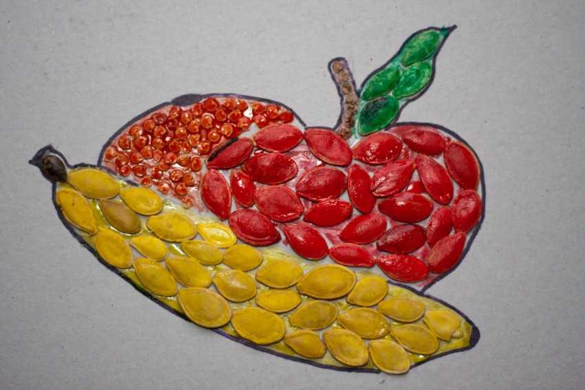 Первый способ самый трудоемкий, так как предполагает нанесение краски на каждую семечку по отдельности после выполнения поделки. Данный вариант больше подходит в том случае, если для работы используют небольшое количество семян.