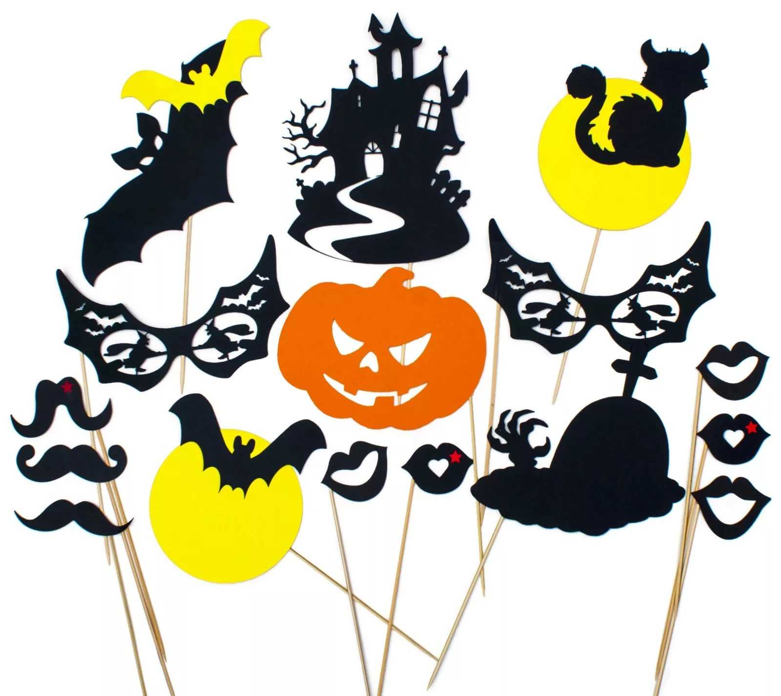 Маски в виде летучей мыши или очков с паутиной – самое простое украшение, которое ребенок может сделать для себя. Усы, губки, маска в виде тыквы – эти шаблоны можно прикрепить к палочке.