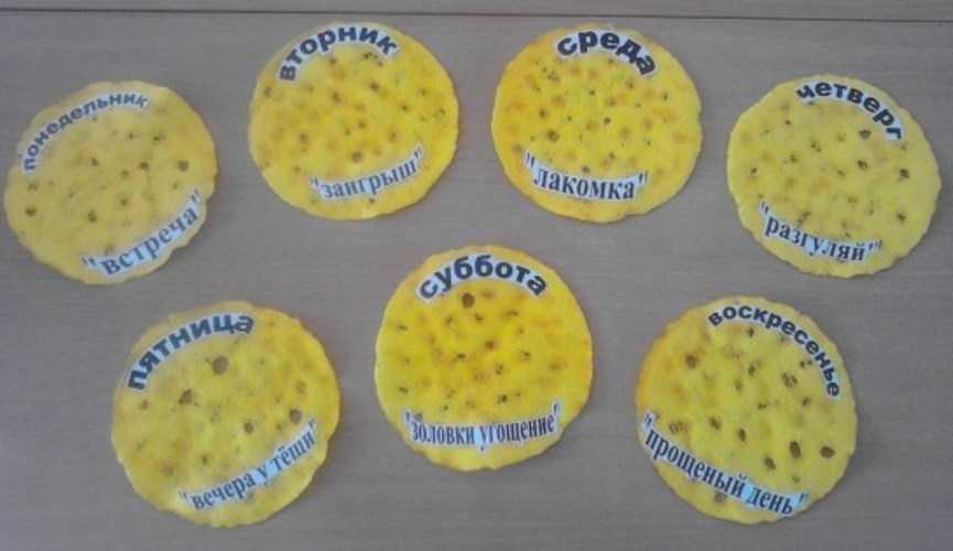 Просто нужно вырезать желтые круглые блинчики из фетра, приклейте на них вырезки из бумаги с названиями дней недели.