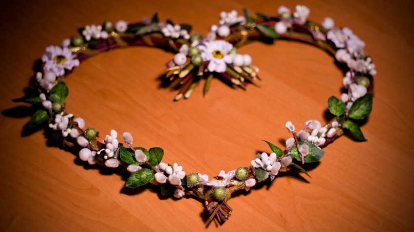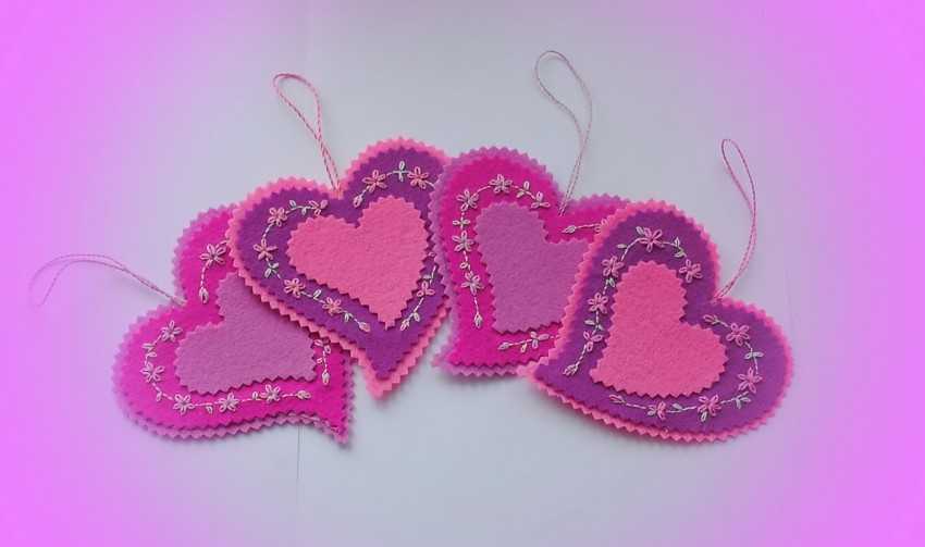 Из бархатной бумаги по шаблону вырезают 2 больших сердца, внутри формируют подобной формы отверстие. Из вырезанного элемента создают ещё 2 схожих сердечка. Раскладывают на ровной поверхности по одному экземпляру, натягивают посредине декоративную ленту, наносят бумажный клей, накрывают второй половиной заготовок. После просыхания украшают бусинами, сажая их на жидкие гвозди.