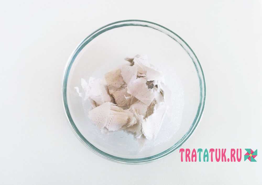 Далее нужно разорвать на кусочки туалетную бумагу и замочить ее в клеевом растворе.