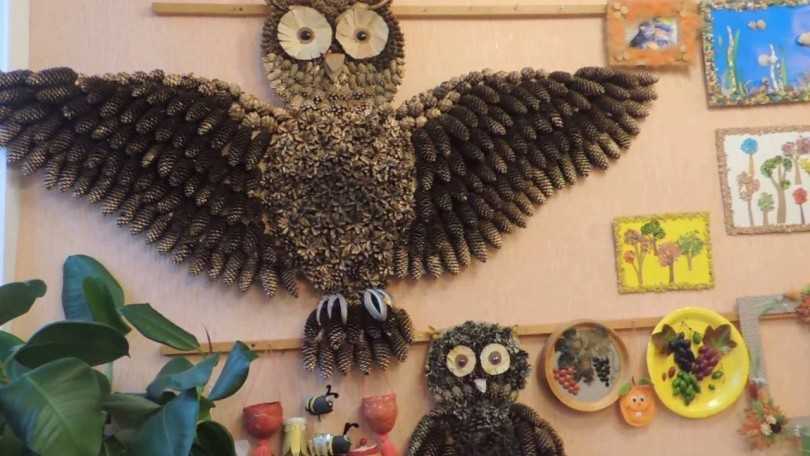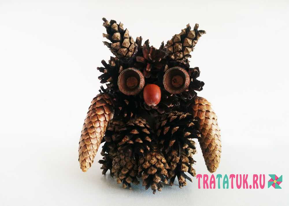 По этому уроку поделка создается из шишек и желудей. Чтобы сделать сову из этих материалов, нужно выполнить несколько простых шагов: