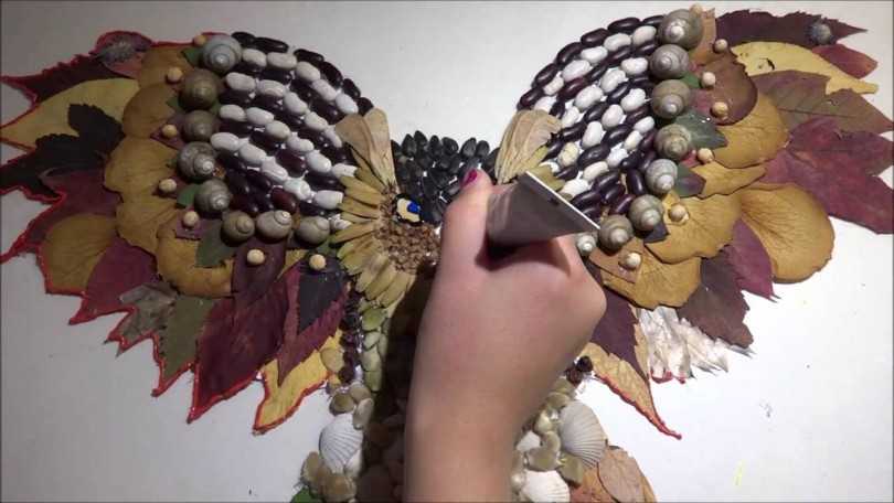 Чтобы плоды легче приклеивались, можно срезать заднюю часть совят и прикрепить их спинками к основе. Также есть вариант сделать силуэты из щепок, разломив соцветия на мелкие куски, но это уже будет почти витраж или мозаика.