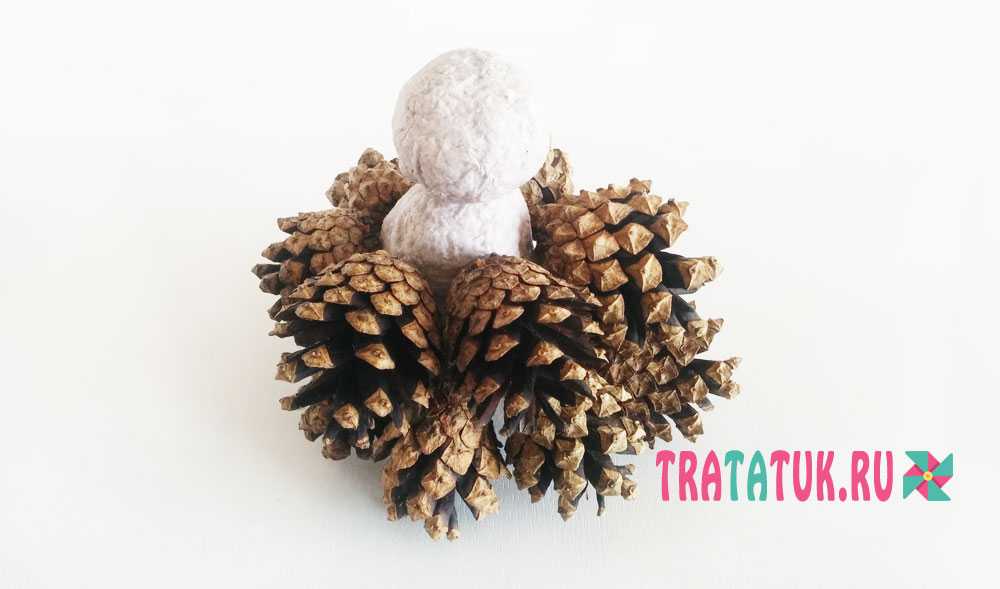 - Приклеить к шишке с двух сторон древесные листья так, чтобы получились крылья.