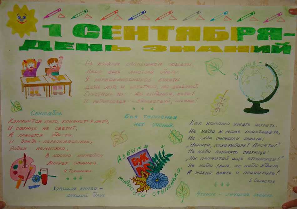 Что написать в стенгазете – каждый решает сам, но, учитывая праздничную тематику, оптимальным вариантом будут стихи с поздравлениями для одноклассников, учителей, директора и родителей. Можно сделать картинку с обычными надписями: «1 сентября!», «Снова в школу!», «С Днем знаний!». Этого иногда бывает вполне достаточно, ведь многое зависит от того, насколько креативно оформлен плакат.