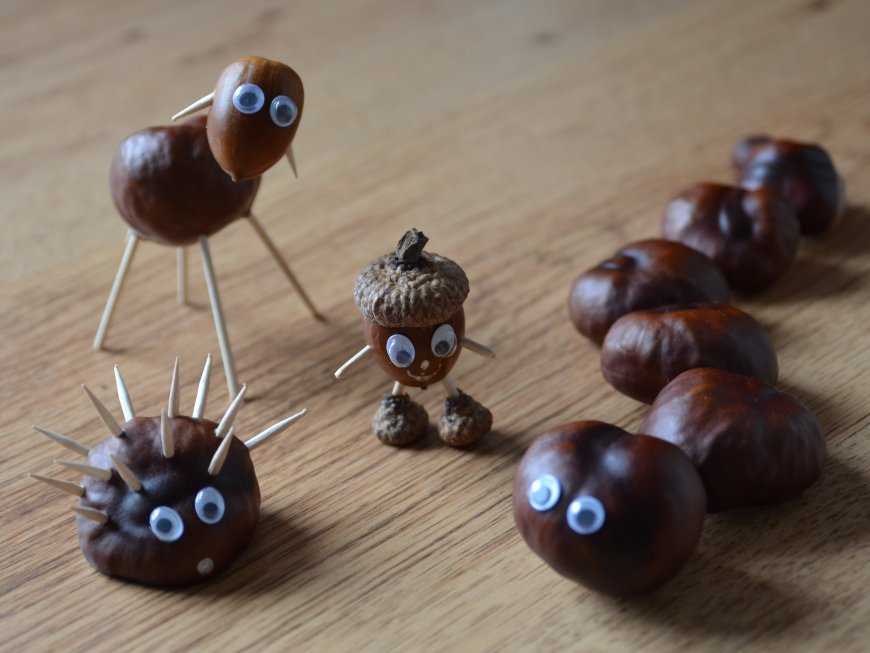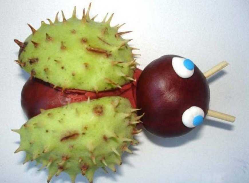 Существует масса вариантов осенних поделок. Это очень симпатичные зверюшки, деревья или грибочки. Часто аппликации и поделки из каштанов дополняют сухими листьями, желудями и веточками.