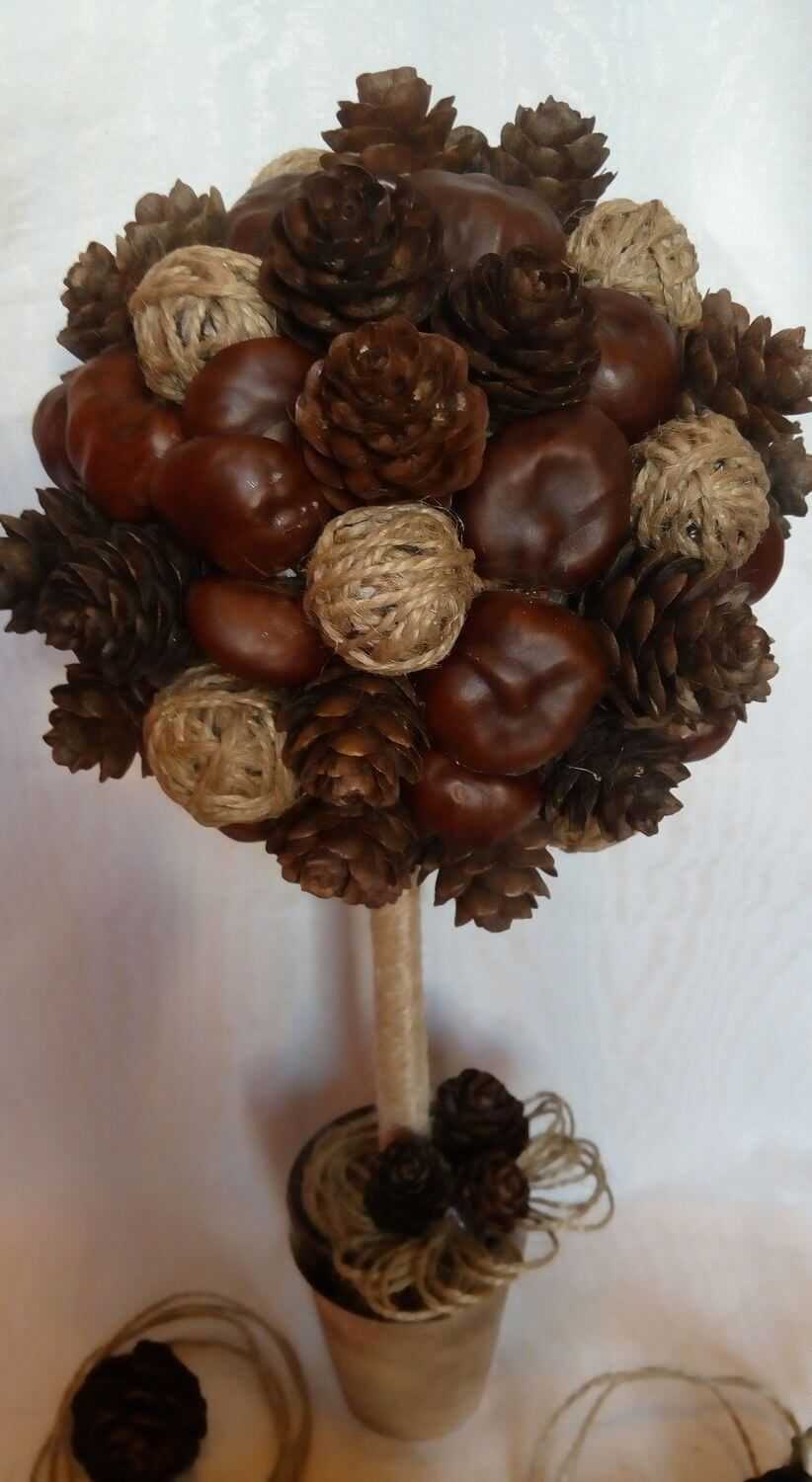 Наряду с распространённым декоративным деревцем из кофейных зерен не менее эффектно смотрится топиарий из плодов каштана. Сделать простую композицию очень легко. У поделки три основные составляющие – шар, ствольная часть и подставка. Элементы декора выбирает автор в зависимости от предпочтений.