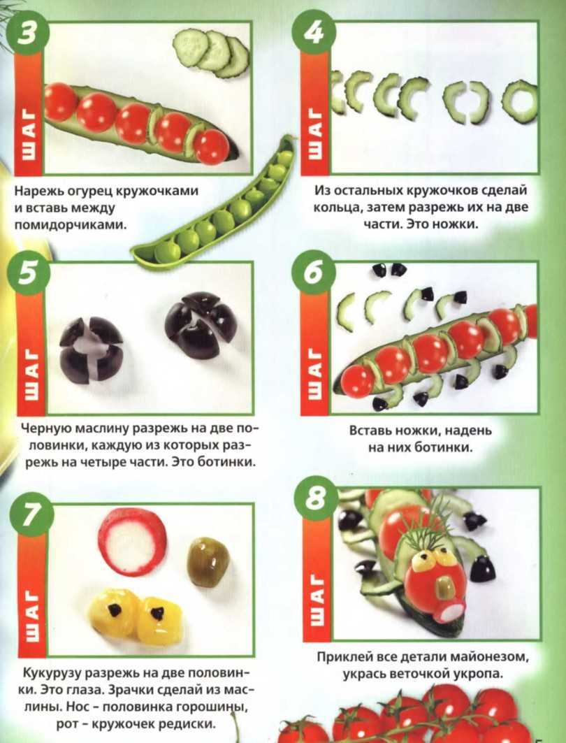Делают спичками, глаза – ягодами рябины, смородины. Гусеницу укладывают на свежую зелень.