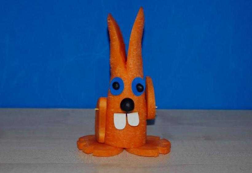 Перед тем как начать делать из овощей поделку зайчика, морковь нужно очистить от кожуры, помыть и высушить салфеткой. Нижняя часть изделия должна быть ровной и гладкой, поэтому надо обрезать край ножом. Заостренная часть овоща делится пополам на длину ушей. Руками немного раздвиньте их в разные стороны. Затем из остатков овоща вырезают тонкие кружочки. Для рук зайчика достаточно убрать боковые участки с двух сторон. А для ног острием ножа сделайте красивые треугольные разрезы, изображающие пальцы. Крепятся руки и ноги с помощью зубочисток.