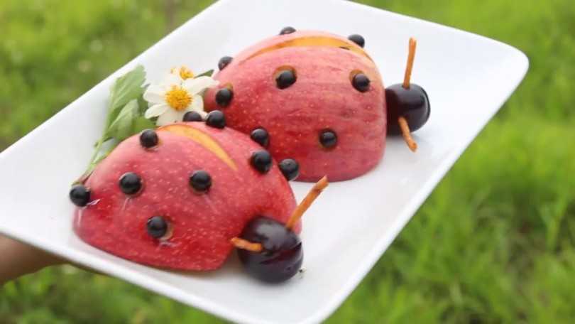 Гусеница. Несколько некрупных яблок, соединенных между собой длинными зубочистками представляют собой основу. На голове дополнительно можно сделать усики и глаза.