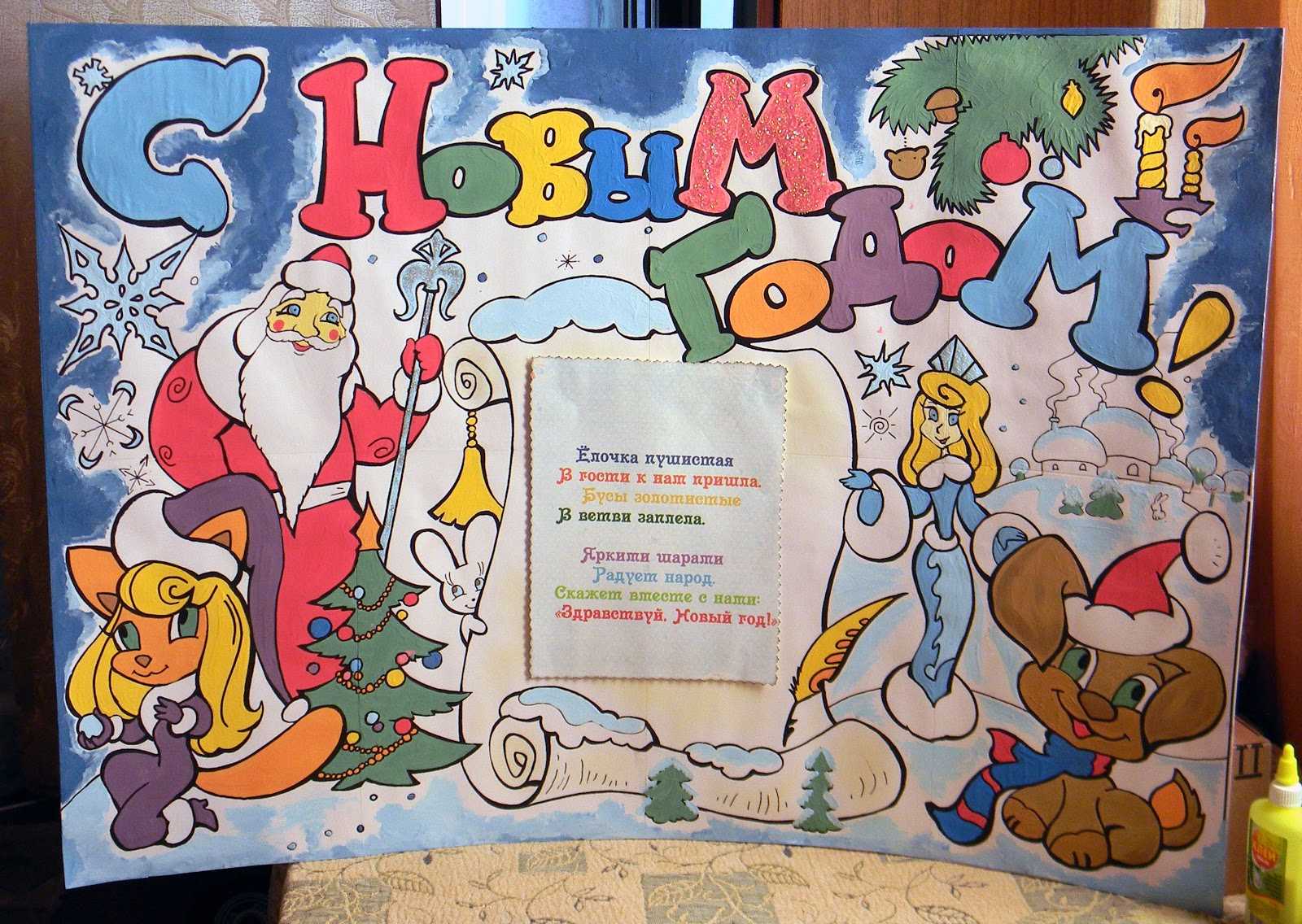 В случае, когда стенгазета посвящена времени года, ее лучше украсить «сезонными» материалами. Например, осенью можно украсить настоящими желтыми листочками, а зимой обычной медицинской ватой.