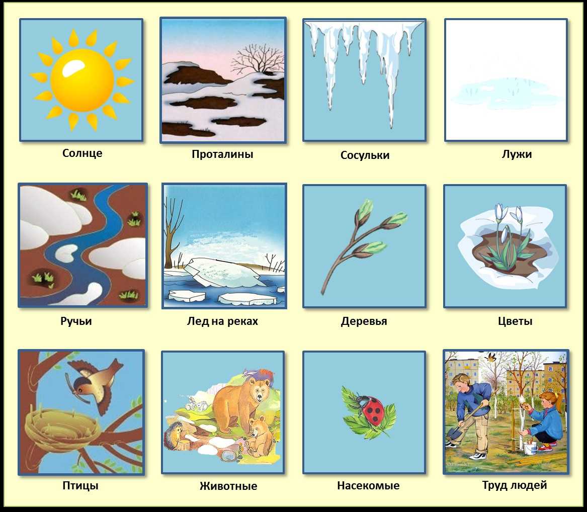 Все рисунки должны быть точными, со всеми деталями. Очень хорошо, если картинка подсказывает ребенку признаки, которые являются отличительными для того или иного предмета или явления. Например, нарисованные резиновые сапоги должны блестеть, а кожаные — нет. Эти особенности обычно учитывают при оформлении наглядного материала для логопедов. Если вам не удалось найти специальный набор картинок с приметами весны, то можно распечатать их из интернета.
