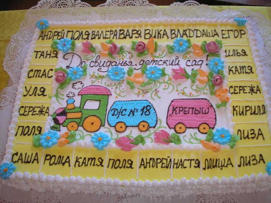- Если в детской группе немного деток, тогда украсьте торт паровозиком с вагончиками. В каждом вагончике напишите имена выпускников.