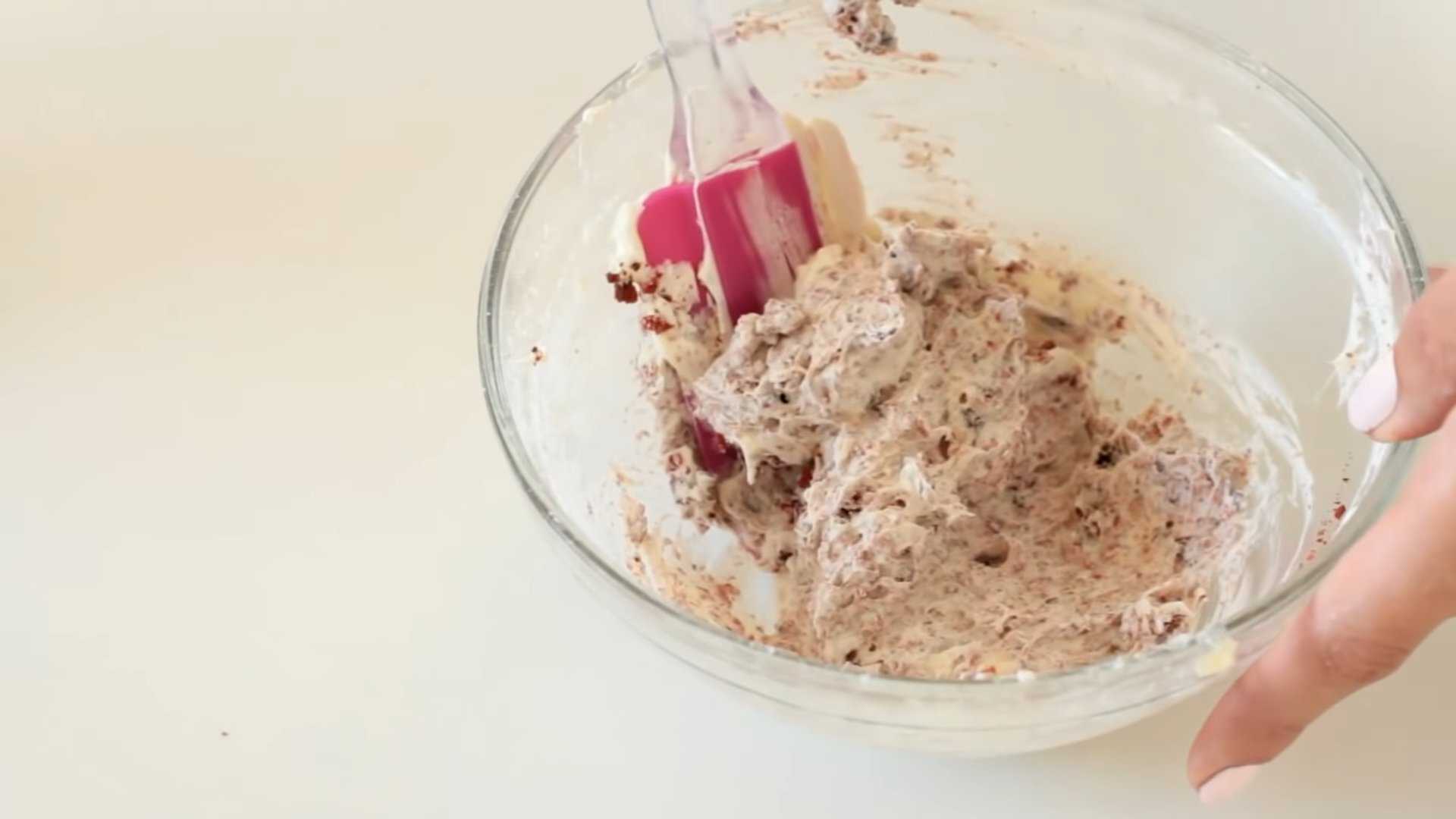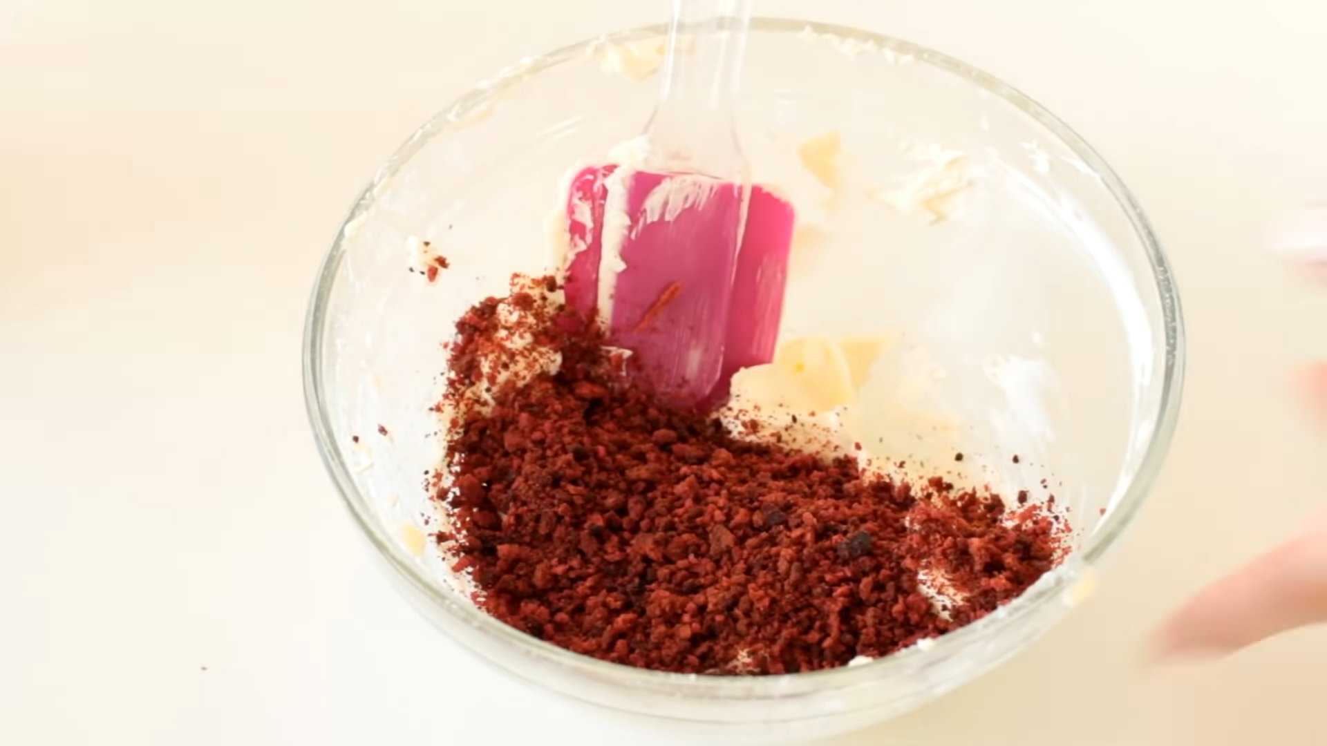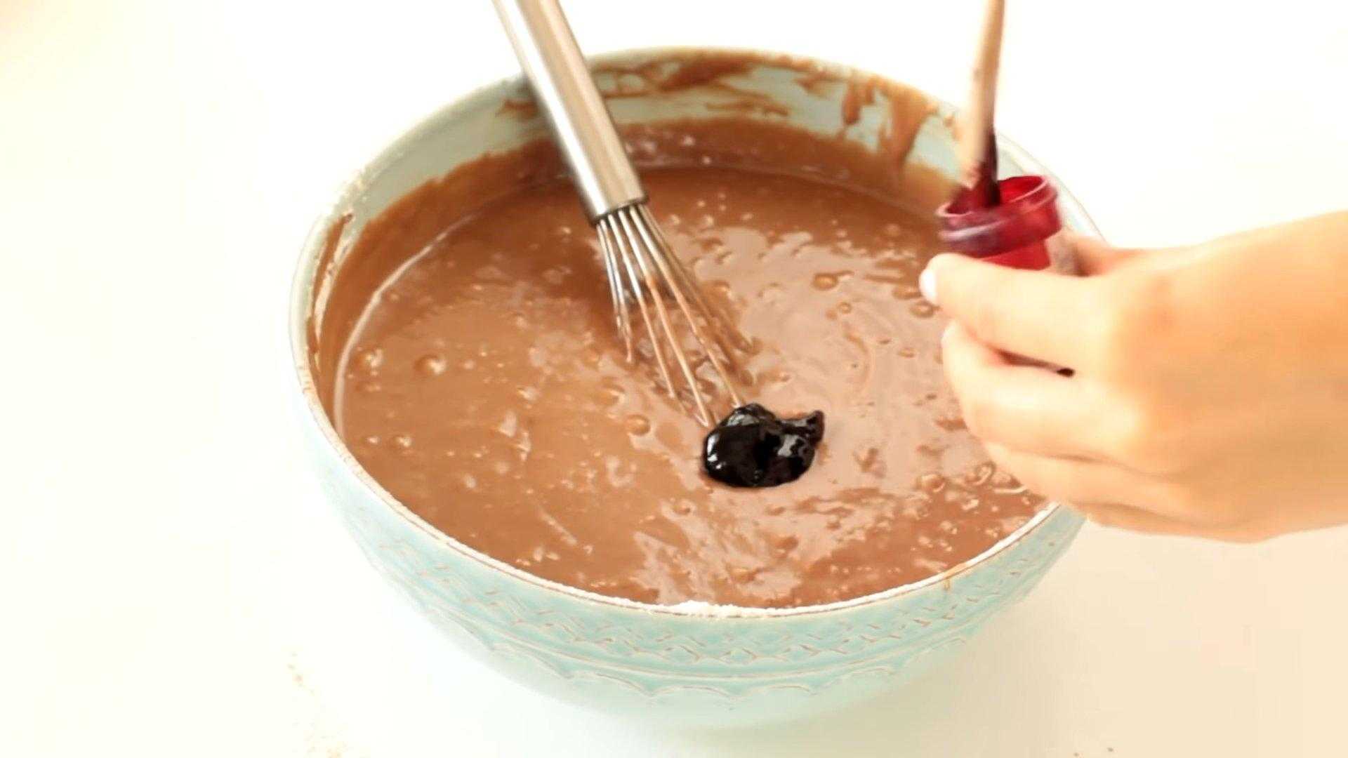 Чтобы придать тесту кровавый оттенок, добавляем в него пищевой краситель красного цвета и хорошо перемешиваем.