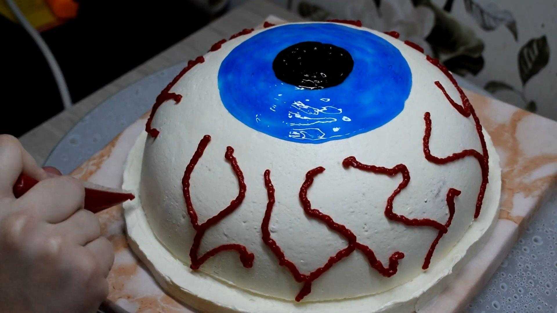 Глюкозный сироп перекладываем в кондитерский мешок и наносим его на торт, имитируя кровь.