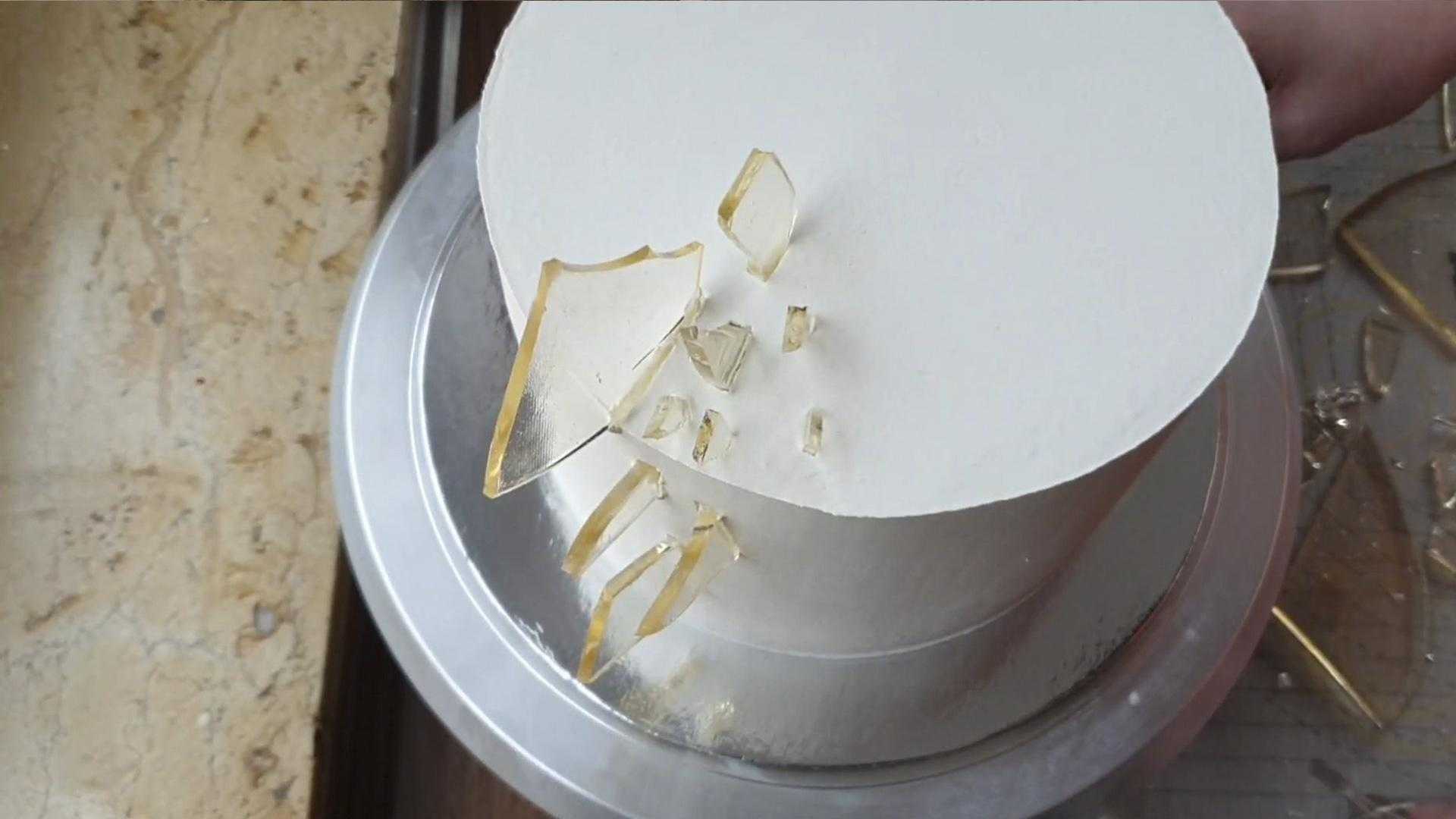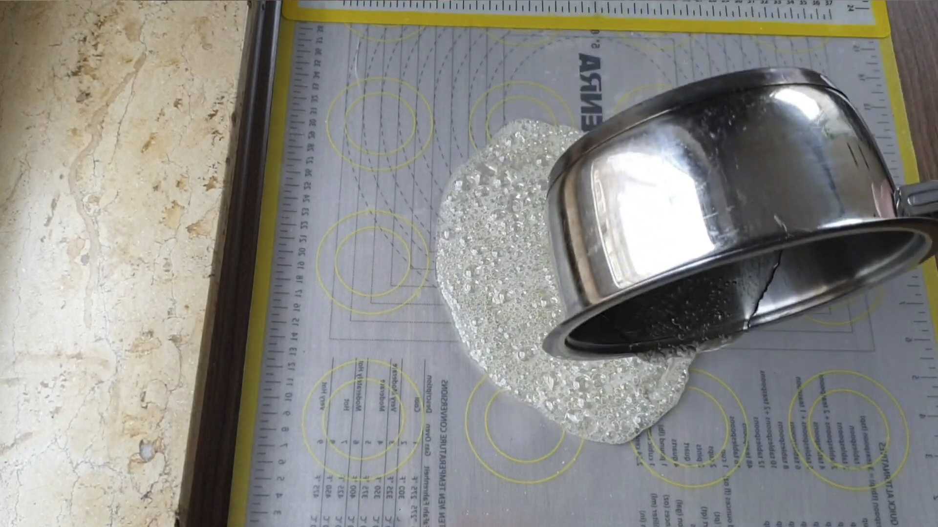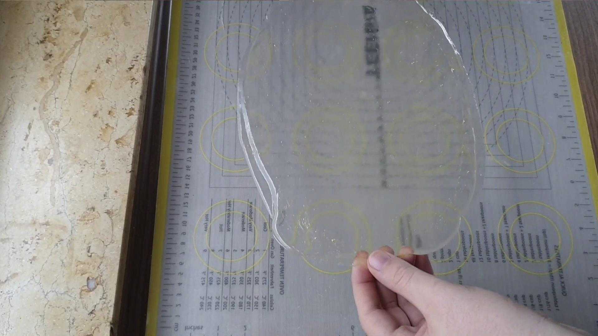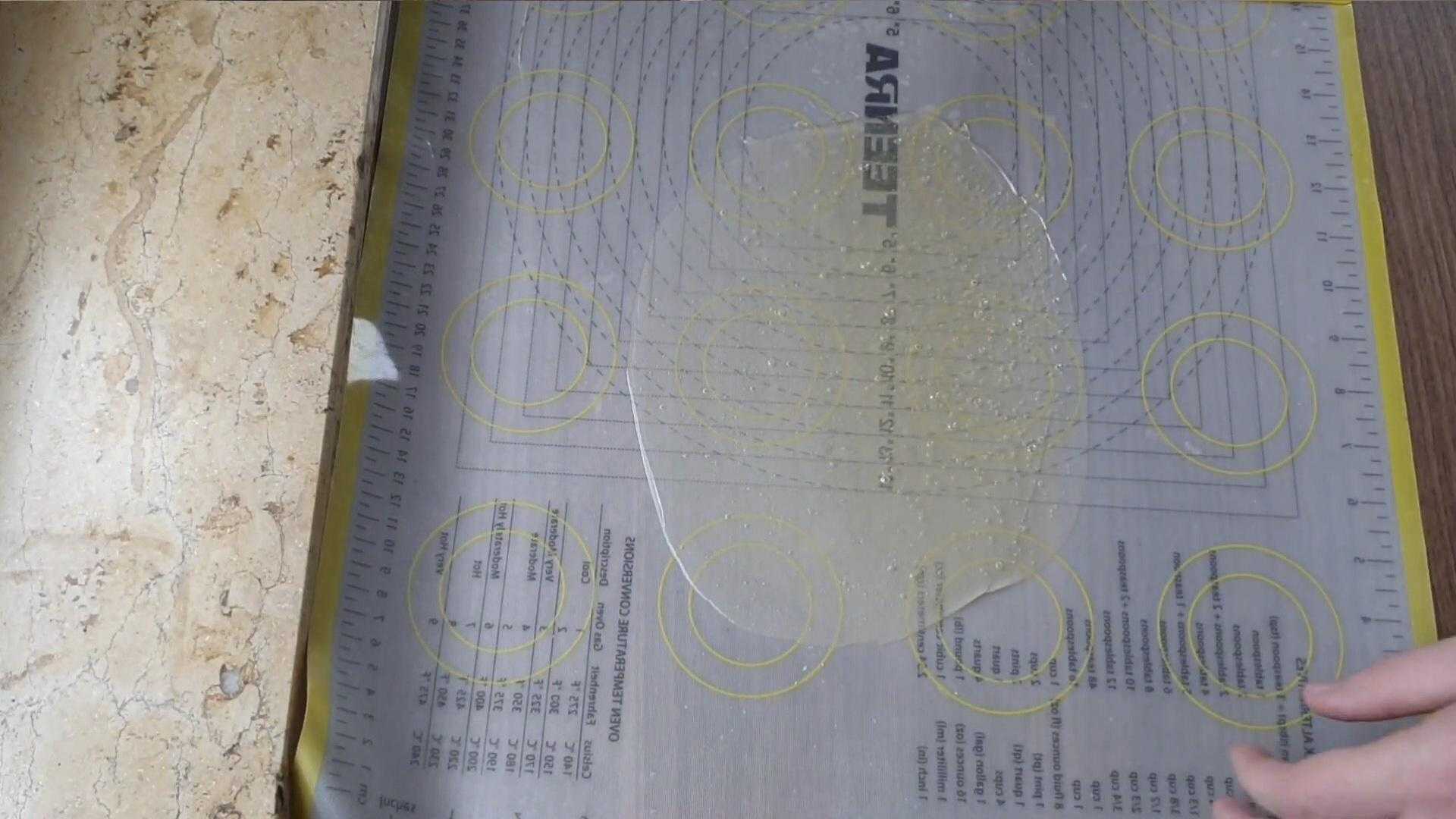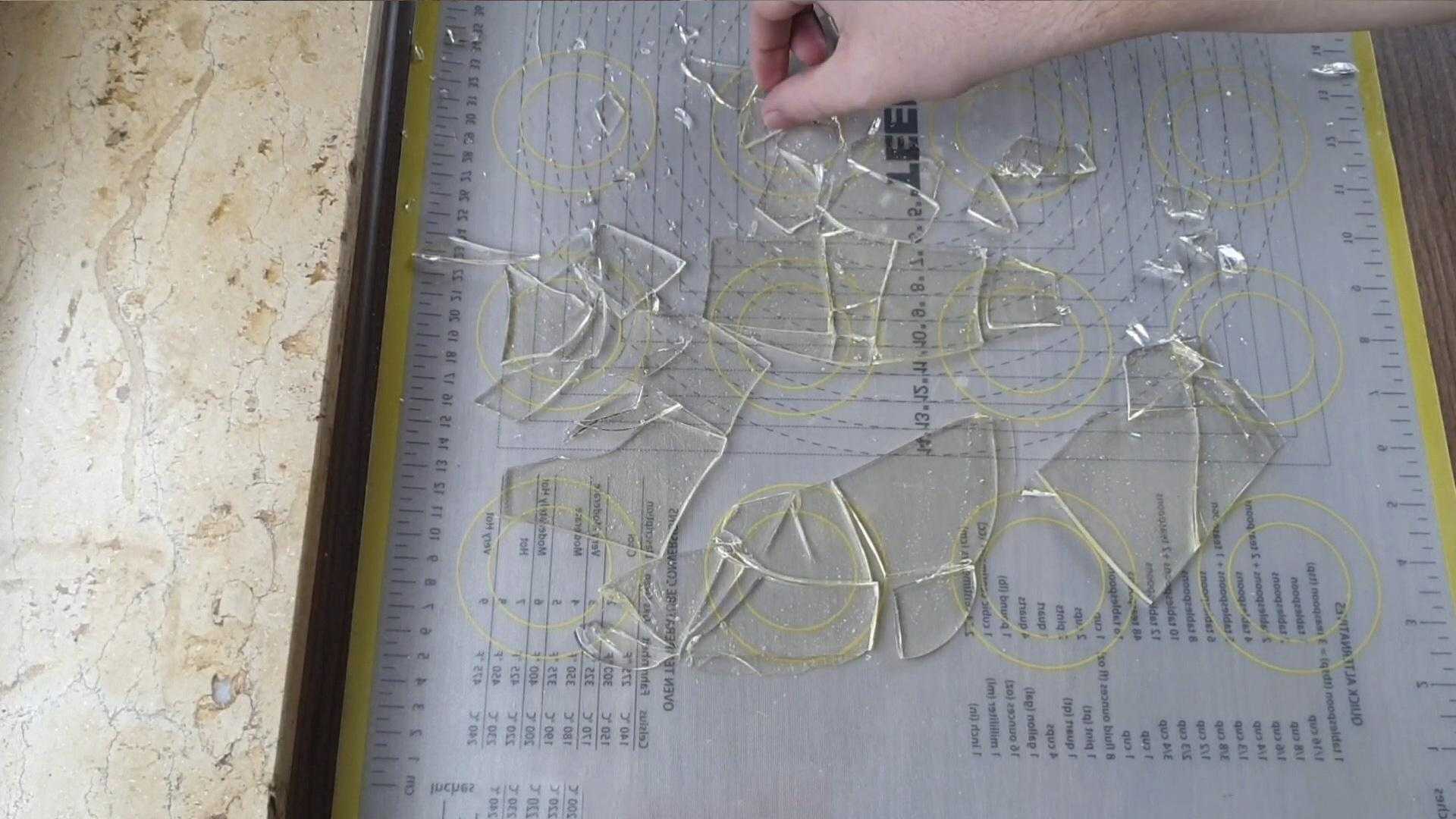 Когда карамель остыла, аккуратно снимаем ее с силиконового коврика и бросаем ею об стол.