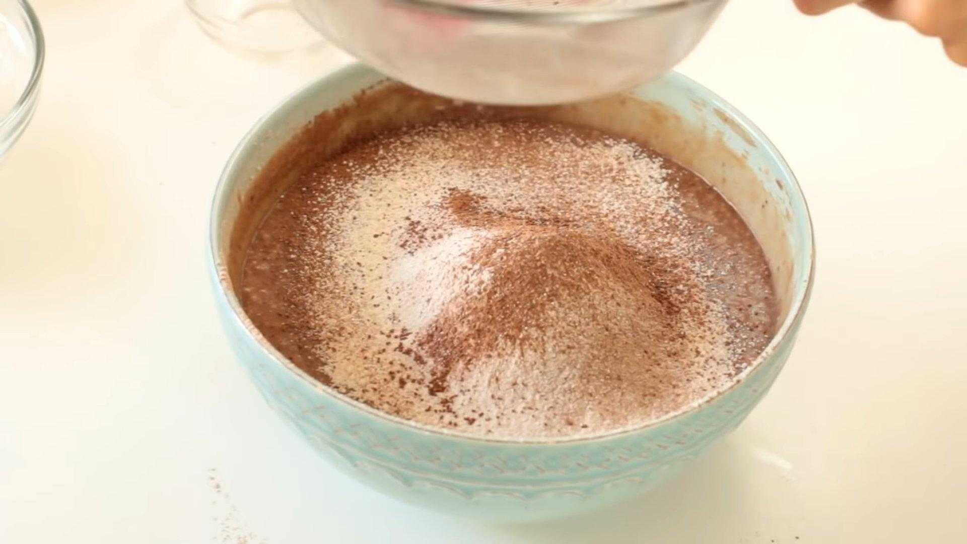 В получившуюся смесь добавляем муку, разрыхлитель, какао и перемешиваем массу до однородности. Желательно просеять эти ингредиенты через сито, чтобы не было комочков.