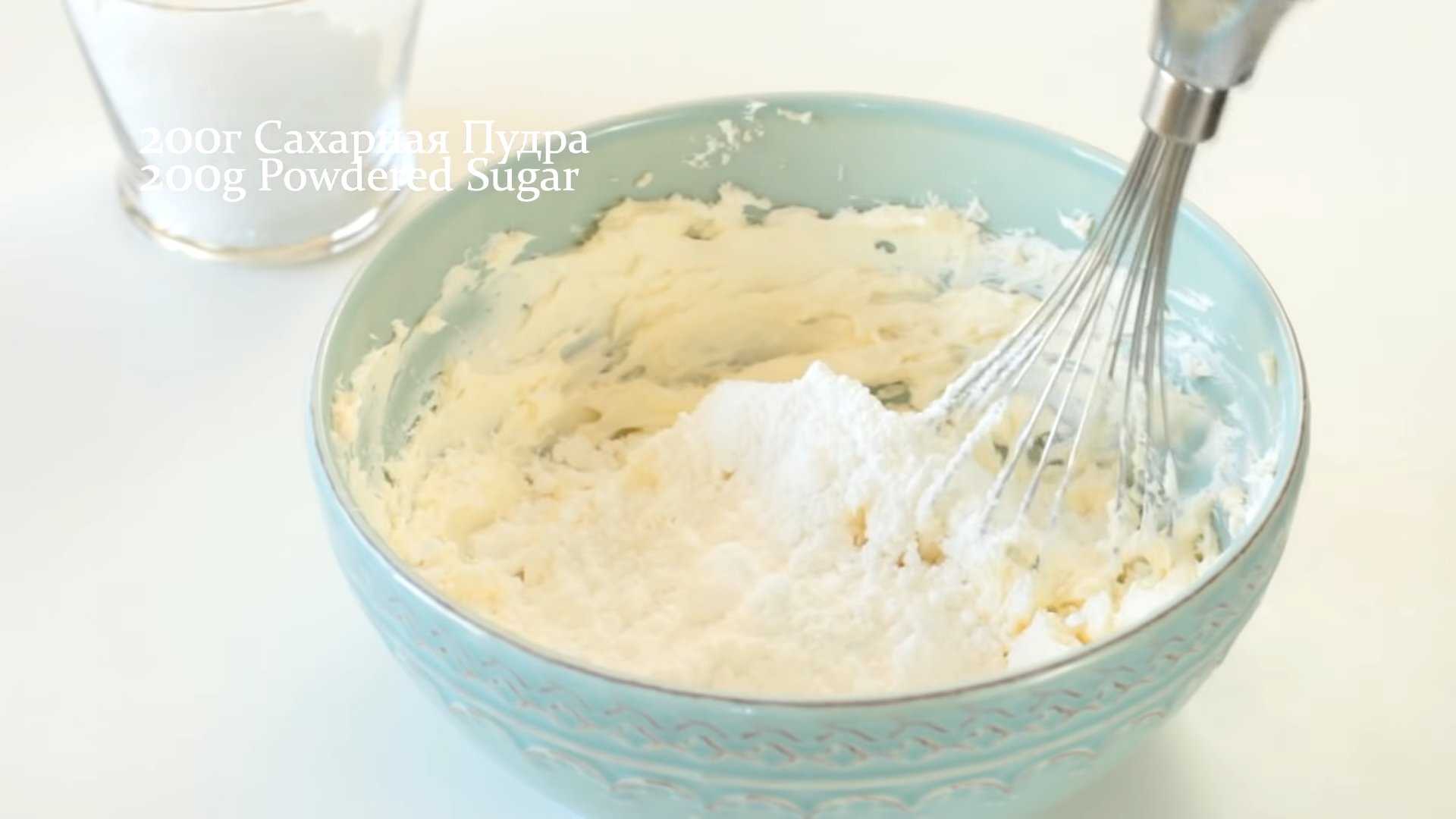 Займемся приготовлением крема. В глубокой миске смешиваем сливочный сыр, 120 г масла и взбиваем их на низкой скорости миксера. Постепенно добавляем 200 г сахарной пудры и хорошо перемешиваем крем до однородности.